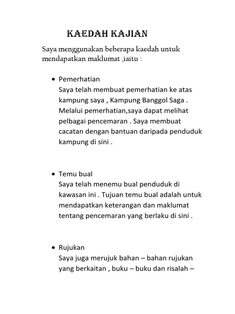 Jan 10, 2017 · penulisan sorotan literatur yang terbaik kajian yang dilaksanakan tidak lebih daripada sepuluh tahun daripada tempoh kajian yang kita laksanakan. Bab ini akan diawali dengan apa itu tinjauan literatur diikuti dengan pencarian literatur masalah metodologis dan standar mutu klasifikasi artikel dan definisi variabel metodologi. Reka bentuk kajian yang dipilih, strategi kajian, teknik kajian serta strategi analisis yang diguna penyelidik dijelaskan. Kajian ke atas sesuatu sesuatu situasi dan individu untuk mendapatkan maklumat secara terperinci serta mendalam pengenalan: Kaedah kajian | find, read and cite all the research you need on researchgate Pemilihan kaedah kajian diadaptasi dari kajian lampau. Itu, kaedah kajian yang dirangka adalah melibatkan reka bentuk kajian, subjek atau sampel kajian, prosedur kajian, prosedur pengambilan data serta prosedur penganalisisan data.